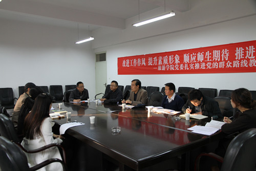 1118下午,江苏经贸职业技术学院旅游外语学院院长胡强一行三人到学院考察学习,召开了专业建设座谈会。学院党委书记贾志斌、党委副书记谢致远、酒店管理系副主任谢民、航空服务与管理系主任柴亚林、团委书记王瑞等参加了座谈会。