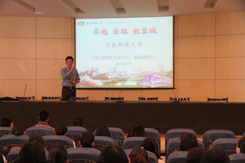3月25日上午,台湾万能科技大学在我校图书馆一楼学术报告厅召开赴台学生学习交流会。台湾万能科技大学观光与休闲事业系助理教授、国际暨两岸交流中心主任蘇俊雄博士,国际交流合作处副处长张国奎,副院长高亚芳教授和永利官网音乐表演专业(空中乘务方向)学生200余人参加了交流会。