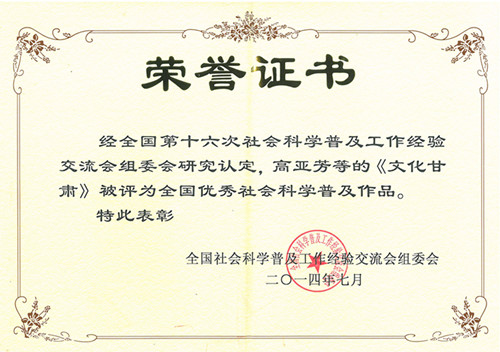 从全国第十六次社会科学普及工作经验交流会获悉,永利官网高亚芳教授编著的《文化甘肃》一书获得全国优秀社会科学普及作品。该书2012年4月由甘肃教育出版社出版,全书以甘肃山水形胜的地理单元为背景和舞台,以甘肃历史文化的形成时间为纵向轴线,将全省从伏羲女娲一画开天的始祖文化到周先祖文化、秦早期文化、彩陶文化、敦煌文化、长城文化、简牍文化和现当代红色文化等甘肃在华夏文明史上具有代表意义的文化单元和类型进行了梳理、展示和价值再现,对当代甘肃省为全世界贡献的《读者》、《大梦敦煌》等文化品牌也进行了文化特色和价值阐释,既是对华夏文明在甘肃的特色资源的整理、挖掘,也是对甘肃文化价值的展示、宣传教育和普及,进一步增强全省人民对本省“历史文化厚重,是中华民族重要的文化资源宝库,发展潜力巨大”的文化省情的自豪感和认同感,激发全省建设文化大省,建设华夏文明传承创新区的积极性和主动性,为全省经济社会发展做出贡献。