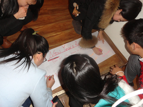 活动主要有两个环节,第一环节由马良相同学主持,在场同学以“Things you can't forgoet about in 2014 or things you want to do in 2015”为话题,展开了愉快的交流和讨论,现场气氛热烈。同学们还在准备好的New Year’s Resolution的白纸上写下了他们的新年愿景。随后的游戏环节由肖涵同学主持,在“Match game”这个游戏中,每个同学有一个身份,需要通过交流寻找和自己“配对”的身份,比如“猫”和“老鼠”是一对,“米奇” 和“米妮”是一对。时间一分一秒地过去,经过愉快的相处和热烈的的讨论后,在“Two truth one lie”游戏环节全场的气氛更加活跃,所有的参与者都乐于其中。到场的每一位外国留学生都感受到了304am永利集团官网学生学习英语的热情和说英语的风采。不知不觉,时间接近21点,在“Free talk”畅所欲言环节之后接近尾声。活动最后,何田田老师对同学们的表现称赞不已,进行了简单总结并留下寒假任务,希望同学们在假期不忘英语学习,寻找同城说英语的外国人进行对话并用照片记录下你们的勇敢行为等。