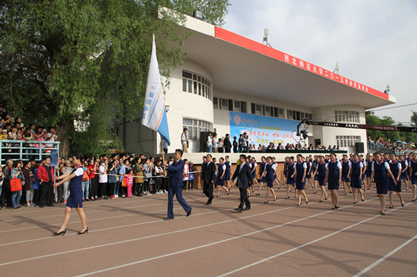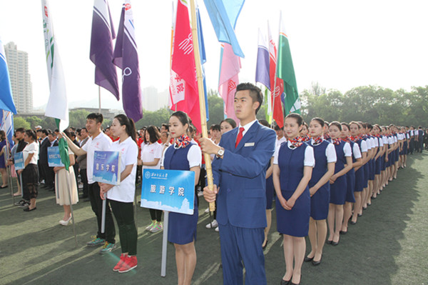 在5月13日上午的入场仪式上,永利官网全体教工和2014级音乐表演(空中乘务方向)96名本科生组成的方队在党委书记贾志斌、院长把多勋的带领下,昂首阔步,英姿飒爽的走过主席台,整齐划一的方队赢得了在场观众的阵阵掌声。