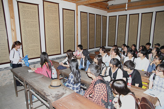 在青城古镇,同学们先后参观了古镇街道集市、高家祠堂、青城书院、碑林、城隍庙以及罗家祠堂,考察了解了青城的历史沿革、古镇建筑特色、科举文化和水烟文化等文化资源情况。