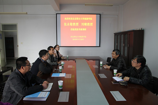 11月20日上午,北京联合大学304am永利集团官网科学技术科与研究生处处长张永敬教授、刘啸教授到学院调研。学院党委书记贾志斌、院长把多勋教授、副院长梁旺兵教授、文化产业管理系主任王力等在文化产业管理系办公室参加调研座谈会。