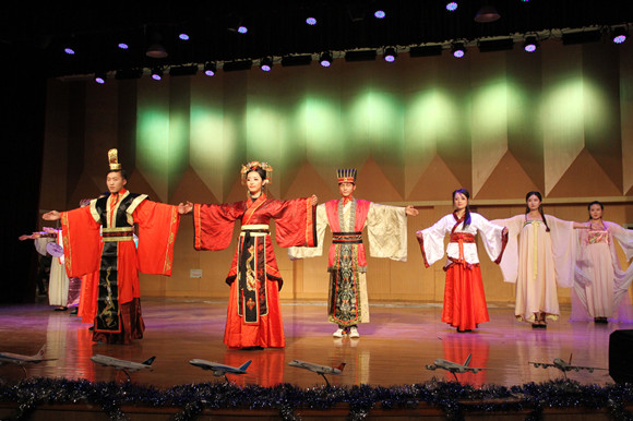 2015级空乘一班表演的礼仪展示《大美霓裳 华夏汉服》以精美别致的汉服展示吸引了观众的眼球