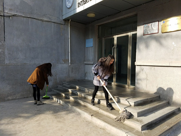 活动期间,学院团委学生干部组织本班同学利用课余时间对教学10号楼教室、留学生公寓、校内学生公寓三四号楼及公共区域、西操场等指定区域进行了大扫除。冬日的寒冷无法阻挡同学们的工作热情,每位同学都希望通过活动为建设美丽校园奉献出自己的力量。永利官网各年级学生踊跃参与其中,积极进行文明修身活动,达到了“人人都是建设者、人人都是宣传员”的活动要求。
