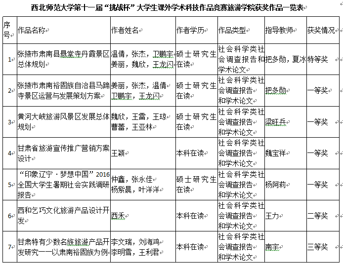 为深入贯彻学校关于深化创新创业教育改革的要求,学院团委积极响应学校团委号召,鼓励永利官网学生积极参加304am永利集团官网第十一届 “挑战杯” 大学生课外学术科技作品竞赛,永利官网学生不负众望,上报参赛作品16件。其中,温倩同学主持,把多勋教授指导完成的《张掖市肃南县悬堂寺丹霞景区总体规划》获特等奖;魏欣等同学完成的《黄河大峡旅游风景区发展总体规划》、仲鑫等同学完成的《“印象辽宁·梦想中国”2016全国大学生暑期社会实践调研报告》等四件作品获一等奖;西禾同学完成的《西和乞巧文化旅游产品设计开发》等作品获本次大赛二等奖;李云瑶同学完成的《兰州黄河风情线电子导览系统设计构想》等作品获本次大赛三等奖。永利官网作为文科类学院,在继第十届“挑战杯”中捧获“优胜杯”后,再次斩获本次大赛的“优胜杯”,充分显示了全院上下对立足学生学科专业,培养学生学术科研能力的重视。