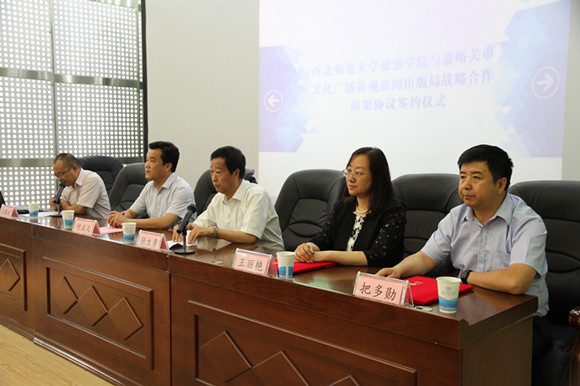 嘉峪关市文广新局局长王丽艳同志与学院院长把多勋教授代表双方签约。