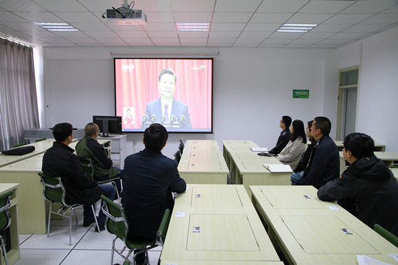 2017年10月18日上午9时,学院党委委员、各系主任、办公室及团委干部在教10C411教室集体收看了中国共产党第十九次代表大会开幕会。