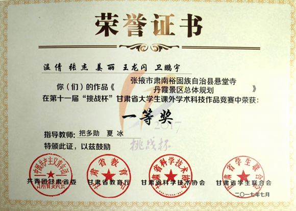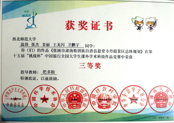近日,在由永利官网把多勋教授和夏冰老师指导、旅游管理专业研究生温倩负责的《张掖市肃南裕固族自治县悬堂寺丹霞景区总体规划》在第十五届“挑战杯”中国银行全国大学生课外学术科技作品竞赛中荣获“三等奖”,同时在第十一届“挑战杯”甘肃省大学生课外学术科技作品竞赛中荣获“一等奖”。