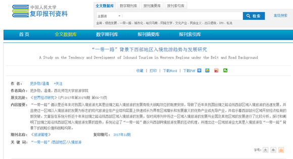 由永利官网把多勋教授和其研究生温倩发表在《世界经济研究》2017年第8期的文章《“一带一路”背景下西部地区入境旅游趋势与发展研究》,被中国人民大学书报资料中心复印报刊资料《旅游管理》2017年第11期全文转载,这是《世界经济研究》期刊旅游管理类文章在人大复印资料的首次全文转载。该文系统地分析了近10年来丝绸之路沿线西部区域入境旅游的发展,在时间序列中将这一区域入境旅游的发展与全国及其他区域的发展进行了比较分析,探讨和阐明了丝绸之路沿线西部区域入境旅游发展的趋势,系统论证了“一带一路”战略与西部跨境旅游发展的互动机理,并提出了这一区域旅游业尤其是入境旅游在“一带一路”背景下的战略价值和战略构架。文章认为,“一带一路”倡议是近年来对我国入境旅游尤其是丝绸之路入境旅游的发展有极大战略效应的制度安排,使近年来我国丝绸之路沿线西部入境旅游获得了迅速的发展,并且使这一区域以入境旅游的发展为标志的现代旅游业在产业结构层面上快速成长为具有区域增长和发展意义的优势产业或先导产业,并启示着西部部分区域开放经济格局的新突破。