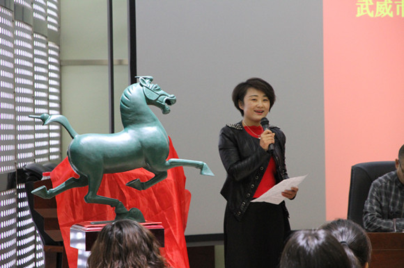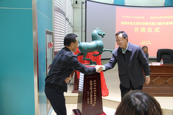 武威市旅游发展委员会副主任张银山代表武威市旅游发展委员会为304am永利集团官网赠送了中国旅游标志铜奔马。