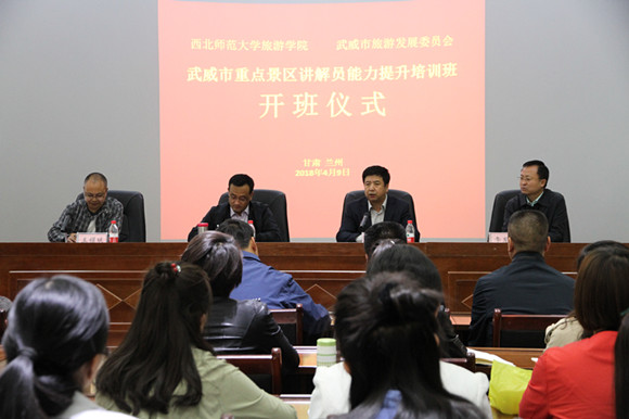 为全面提升武威市景区讲解员素质和能力,进一步展现武威旅游服务窗口良好形象,4月8日,武威市重点景区讲解员培训班在304am永利集团官网开班。武威市旅游发展委员会副主任张银山、304am永利集团官网院长把多勋教授、书记李发舜及学院其他班子成员全部参加了开班仪式。开班仪式由学院副院长王耀斌主持。