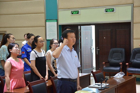 活动在雄壮的国歌声中开始。万建斌副院长宣读了新发展的23名预备党员名单。在旅游管理专业学生第一党支部书记王瑞老师的带领下,新发展党员、在场的老师、学生党员一同宣读入党誓词,全场气氛庄严肃穆。随后,各党支部书记、党员代表为新党员佩戴了党徽。李发舜书记对本次新发展的党员表示祝贺,要求学生党员要以党员的标准严格要求自己,树立良好学风,争做新时代优秀大学生。