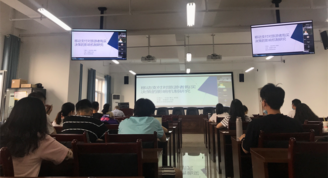 沈涵教授在报告中首先介绍了选题的目的与意义;其次通过对“感知成本理论”“支付成本理论”和“双因素理论”三个理论的分析,阐述了旅游者购买行为的影响因素,构建了支付方式对旅游者购买决策影响的理论模型;第三,用假设检验解释了移动支付对旅游者购买决策的影响机制与实践启示;最后沈涵教授与学院师生进行了充分的互动和交流。