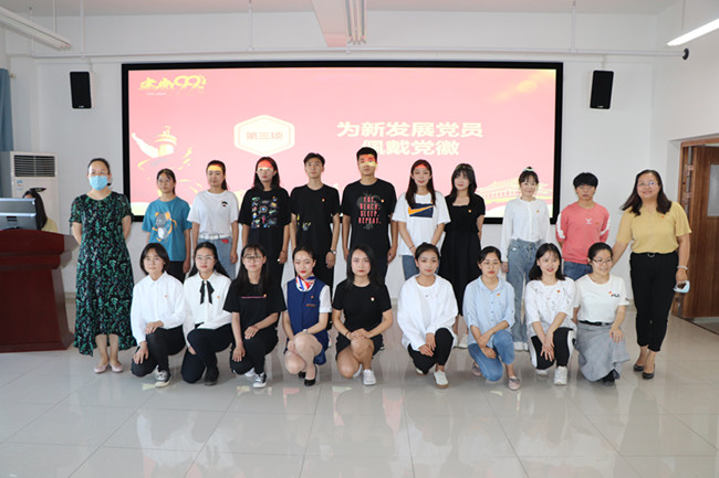 学院党委副书记谢致远宣读院党委接受底贞等32名同学为预备党员的审批决定。教师党员代表彭睿娟老师、种媛老师为此次新发展预备党员佩戴党徽。这一幕,使所有新党员感受到了庄严的仪式感,入党不仅仅要体系在行动上,更重要的是在思想上入党。从今天开始,他们不仅应当以党员身份严格要求自己,同时也应该承担更多的责任与义务。