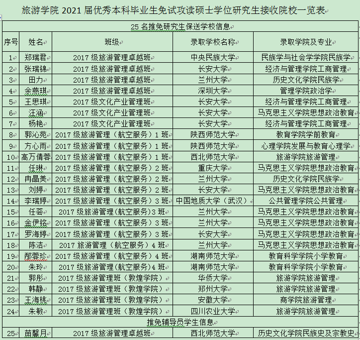 近日,永利官网2020年推荐应届本科生免试攻读硕士研究生学位工作结束,学院共25名学生获得推荐免试资格,其中一名为辅导员计划。截止10月28日,学院25名推免生接收院校已经确定,其中多人被中央民族大学、兰州大学、重庆大学、郑州大学、长安大学、陕西师范大学等985、211院校录取,录取专业涉及管理学、民族学、心理学、教育学、政治学等,专业分布较广,接受单位质量较去年有较大的提升。