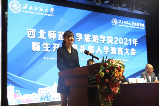 2018级旅游管理卓越班陆文婧代表学院高年级同学发言。她诚恳真挚的分享了个人的成长故事,并鼓励新同学们:人生是一道开放题,从来没有标准答案,我们需要做的是寻找最适合自己的可能,并全力以赴,希望大家从树立小目标开始,以“苟日新,日日新,又日新”的勇气遇见更好的自己。
