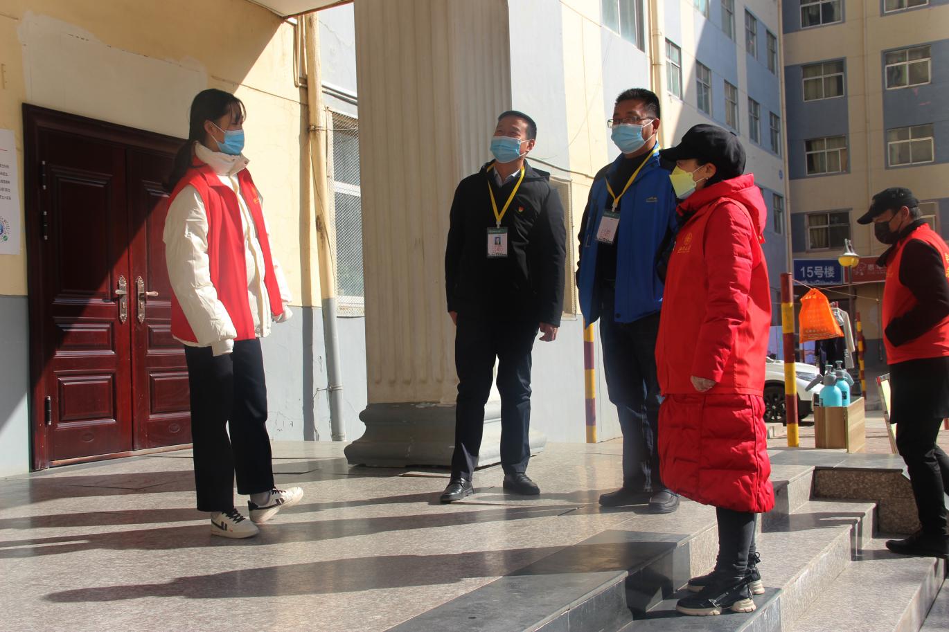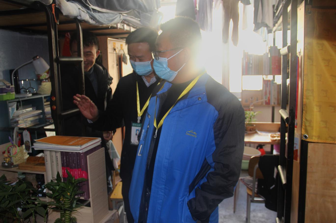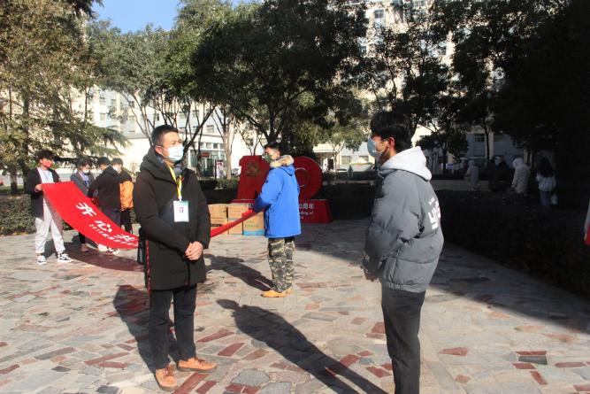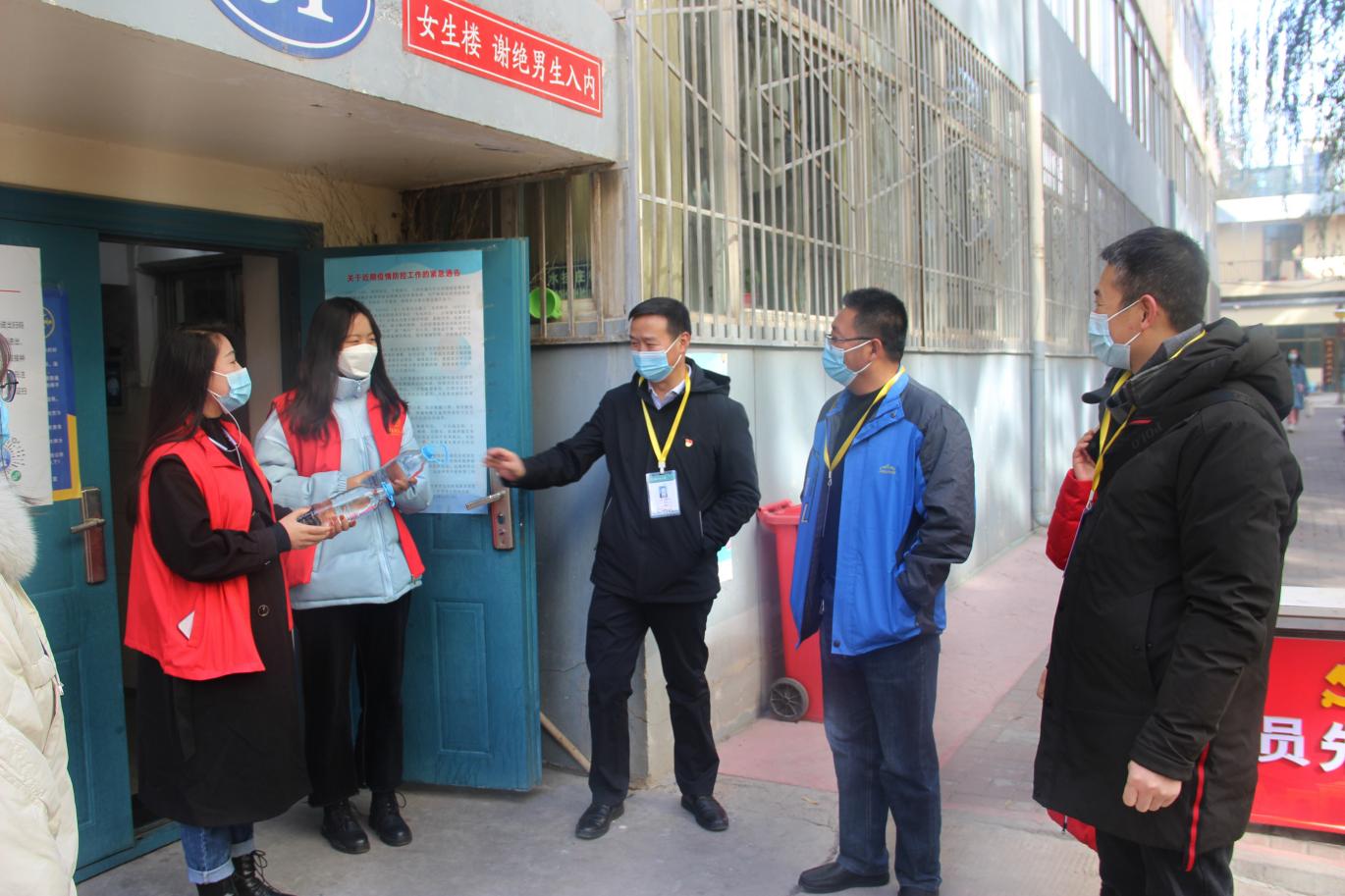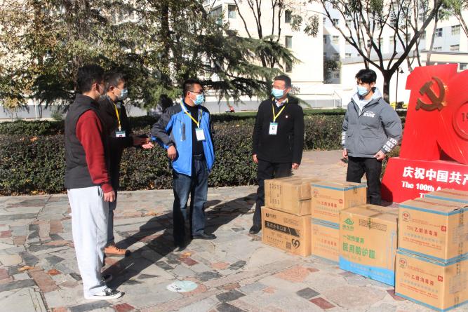 捐赠仪式结束后,学院领导一行深入兰天公寓学生宿舍、学校疫情防控志愿服务岗看望慰问了承担疫情防控志愿服务工作的同学们。“值勤一次多长时间?宿舍线上学习怎么样?还有没有需要协调解决的困难和问题?”谢致远详细了解志愿者开展志愿服务的情况,叮嘱大家在做好疫情防控志愿服务的同时,一定要加强自我防护,对大家舍小家、顾大家,敢于担当、主动作为的志愿热情予以赞扬。