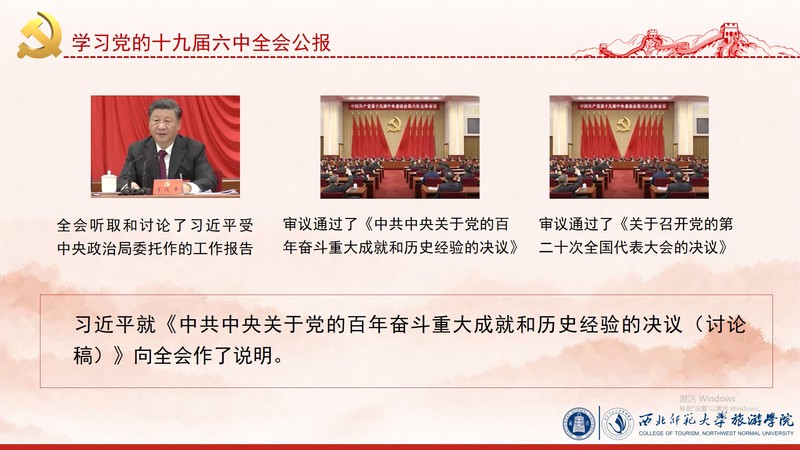 老师们、同学们通过《学习党的十九届六中全会公报》PPT、中央电视台新闻联播相关报道一起学习了党的十九届六中全会召开情况。全会肯定党的十九届五中全会以来中央政治局的工作,审议通过《中共中央关于党的百年奋斗重大成就和历史经验的决议》《关于召开党的第二十次全国代表大会的决议》。