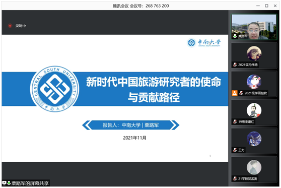 2021年11月25日晚,应学院邀请,中南大学商学院教授、博士生导师粟路军为304am永利集团官网师生做了题为“新时代中国旅游研究前沿及贡献路径”的学术报告。报告会通过腾讯会议线上举行。会议由王耀斌教授主持,学院师生约160人参加了报告会。