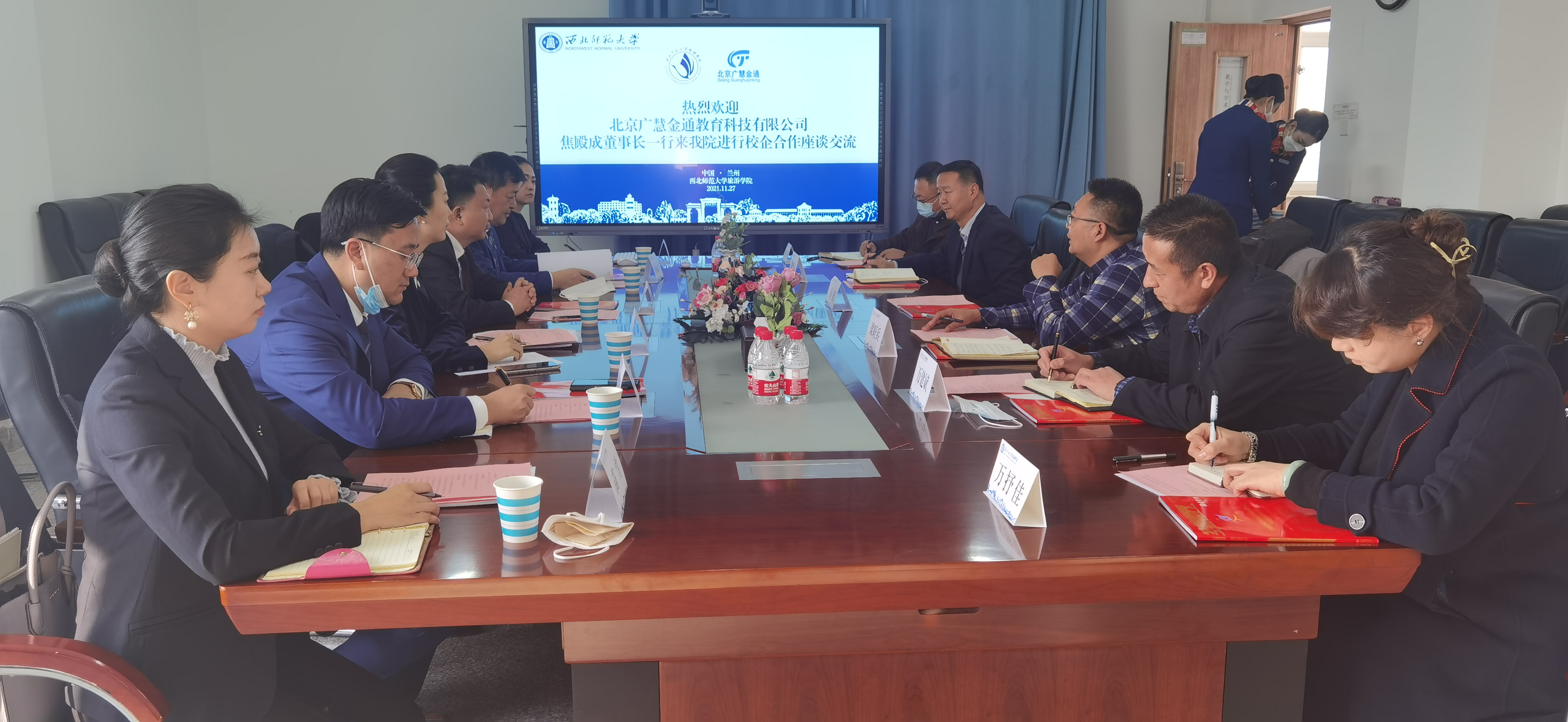 11月27日,北京广慧金通教育科技有限公司董事长焦殿成、副总经理付晓军、李青谦一行来永利官网进行考察交流,校纪委书记马庆、学院党委书记谢致远、院长梁旺兵、副院长万建斌、柴亚林,学院党委副书记戴小武,航空服务与管理系副主任万抒佳,北京广慧金通教育科技有限公司驻304am永利集团官网工作处主任席聪等人参加了座谈会。