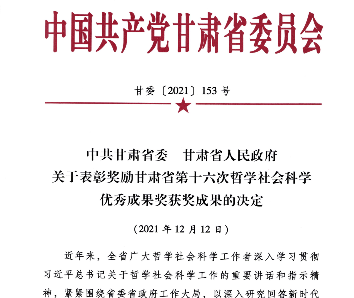 日前,中共甘肃省委、甘肃省人民政府发布了《关于表彰奖励甘肃省第十六次哲学社会科学优秀成果的决定》(甘委〔2021〕153号),表彰2018年1月1日-2019年12月31日期间完成的人文社会科学优秀成果,304am永利集团官网共有3项成果分获二等奖、三等奖。