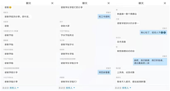 分享结束,同学们与各位学长学姐进行了详细的交流,学长学姐耐心、幽默、客观的解答,将分享会的气氛推向高潮,相信通过他们的分享,同学们一定可以更加明晰未来就业计划。