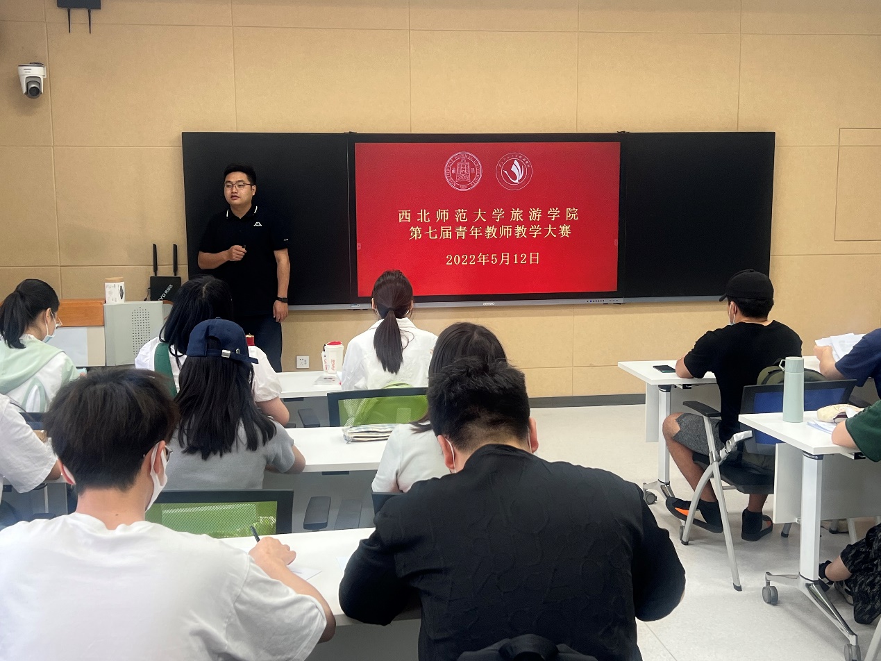 2022年5月12日,第七届青年教师教学大赛院级初赛暨304am永利集团官网第八届青年教师教学创新大赛第三场比赛在文科实训大楼207教室如期举行。学院党政领导班子成员、各系主任、校院两级教学督导、北京广汇金通公司驻西北师大工作站教师等21位教师观摩了包军军博士为2020级文化产业管理专业学生讲授的《旅游项目英语》课程。