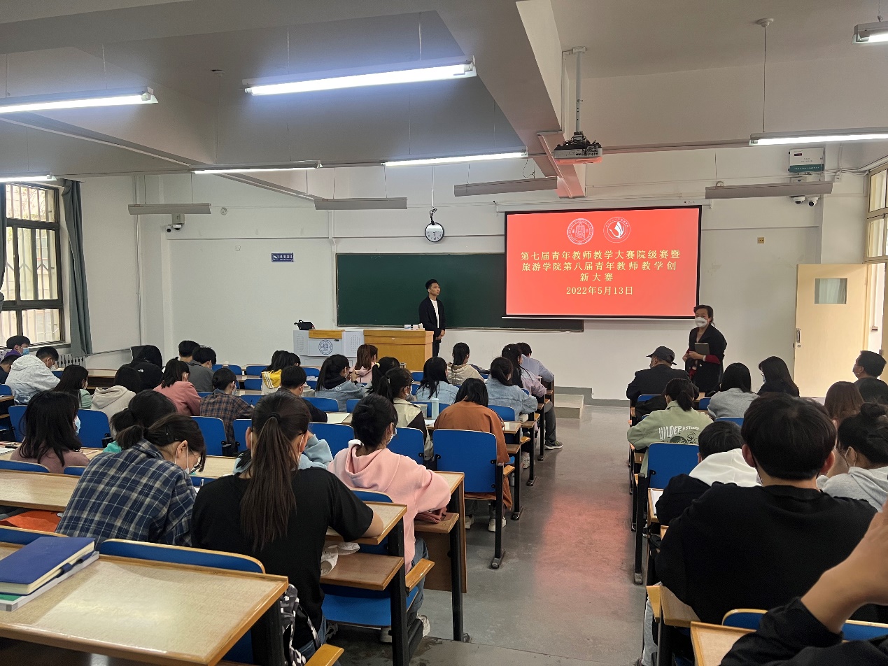 2022年5月13日,第七届青年教师教学大赛院级初赛暨304am永利集团官网第八届青年教师教学创新大赛第四场比赛在田家炳书院104教室如期举行。学院党委书记谢致远、本科教学副院长柴亚林、学院副书记戴小武、杨阿莉教授、欧阳正宇副教授、安智海副教授、魏宝祥副教授等12位教师观摩了马斌斌博士为学校多个专业的近100名本科生讲授通识教育类课程《旅游美学》。