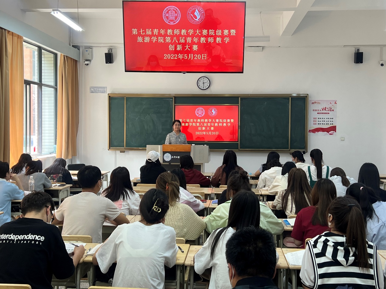 2022年5月20日下午,第七届青年教师教学大赛院级初赛暨304am永利集团官网第八届青年教师教学创新大赛的第八场比赛在10号楼A区114教室如期举行。学院党委书记谢致远、本科教学副院长柴亚林、杨阿莉教授、欧阳正宇副教授、谢民老师、王艳林老师以及侃卓措博士等7位教师观摩了周婧老师为2020级旅游管理专业本科生讲授的《旅游经济学》课程。