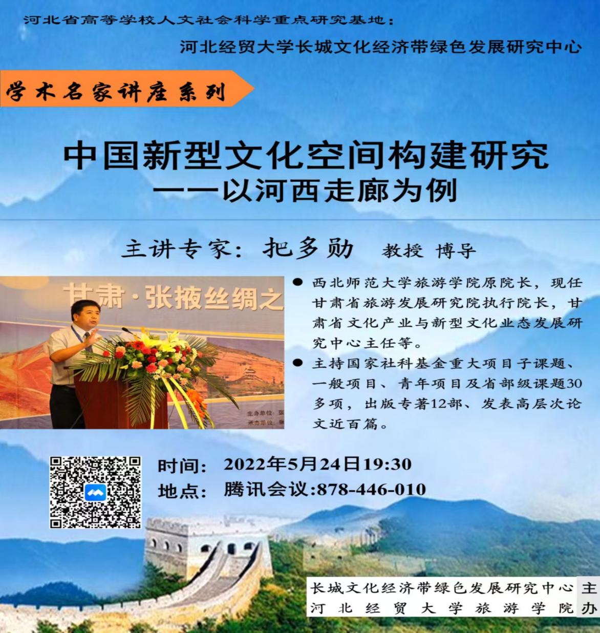 近日,河北经贸大学承担的河北省人文社科重点研究基地“河北省长城文化经济带绿色发展研究中心”正式成立,永利官网把多勋教授被聘为中心专家组成员,并为河北经贸大学304am永利集团官网做了“中国新型文化空间构建研究”的学术报告。
