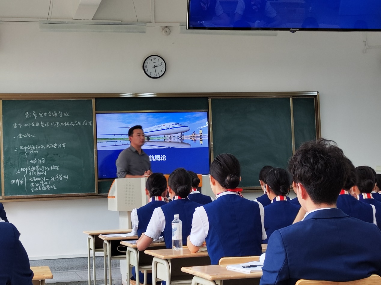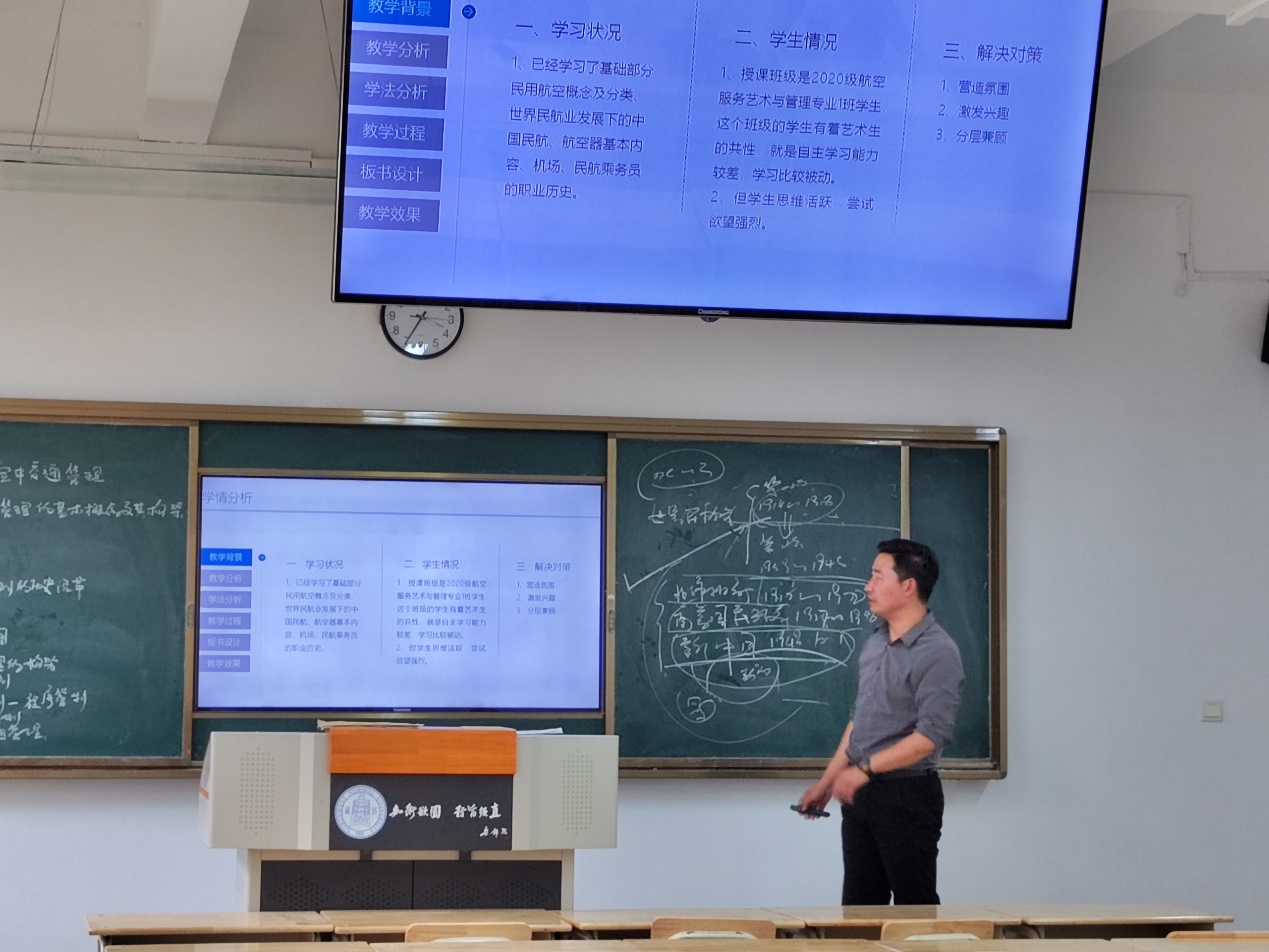 2022年5月26日下午,第七届青年教师教学大赛院级初赛暨304am永利集团官网第八届青年教师教学创新大赛的第十四场比赛在教学10号楼A区308教室如期举行。学院航空服务艺术与管理系主任万抒佳、专业实习中心主任陈娟娟、北京广慧金通教育科技有限公司驻304am永利集团官网工作站主任席聪以及白秀显老师、殷玥老师、宋泽老师等6位教师观摩了邹小强老师为航空服务艺术与管理专业本科生讲授的《民航概论》课程。