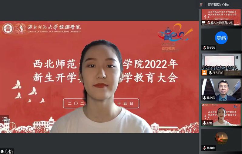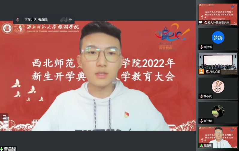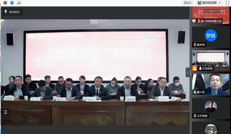 鉴于目前的疫情防控形势,本次开学典礼采用线上线下结合的方式举行,线下设置在文科实训楼904会议室会场,并通过腾讯会议线上直播。300余名新生通过腾讯会议参会。