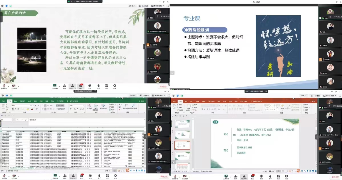 田雅奇根据同学们的复习进度,结合自身经验分享了冲刺阶段的学习规划,提醒同学们要保持良好的心态,坚持到最后一刻。李盈盈从政治、英语、数学、专业课四个考试科目出发,详述了每科的复习要点、做题技巧及时间规划。陈新星介绍了国考、省考、事业单位三种考试类型的时间、科目及相关政策,并分享了笔试、面试技巧。她告诫同学们要慎重做出选择,既然选择了就为一个目标去努力,希望同学们能够放平心态,认真备考。