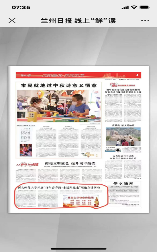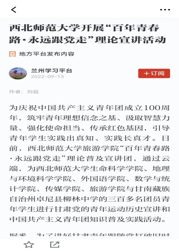 在党的二十大来临之际,在建团百年的历史性时刻,为进一步推进广大青年学生对习近平新时代中国特色社会主义思想的学习领悟,更好地促进高校思政工作建设。今年暑期,304am永利集团官网“百年青春路 永远跟党走”理论普及调研团通过云端,为304am永利集团官网生命科学学院、地理与环境科学学院、外国语学院、数学与统计学院、传媒学院、304am永利集团官网以及甘南藏族自治州卓尼县柳林中学共328名青年学生进行甘肃党的青年运动历史宣讲。