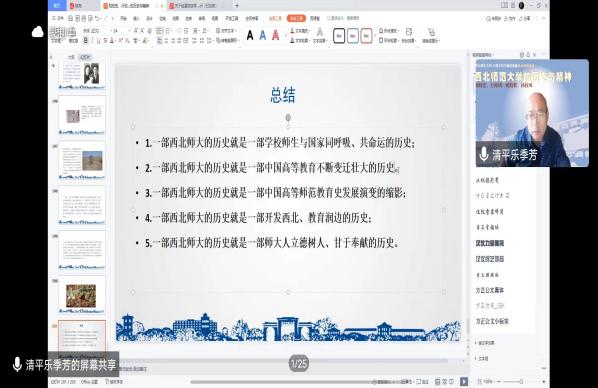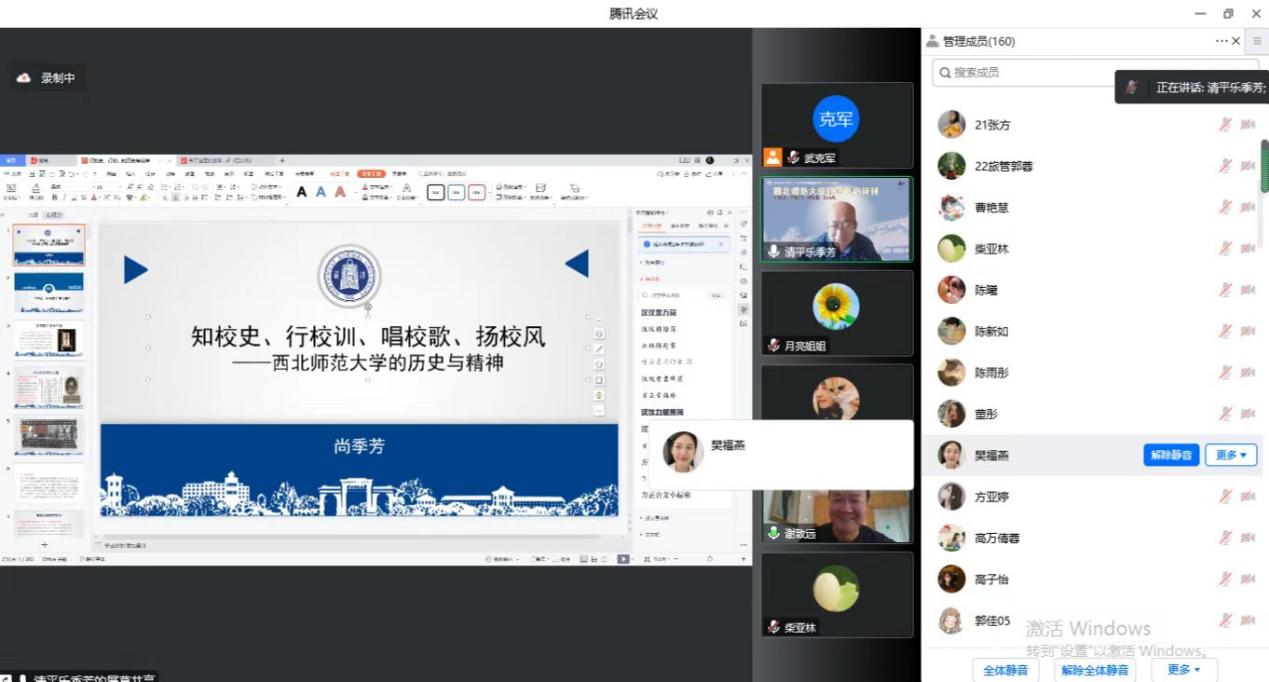 丝路传薪双甲子,长河振铎百廿载。值304am永利集团官网120周年校庆之际,永利官网特邀历史文化学院博士生导师,学报编辑部主任、校史研究中心主任,国家社科基金重大项目“抗战时期西北国际通道资料整理与研究”首席专家尚季芳教授于11月3在线为304am永利集团官网全体师生开展“304am永利集团官网的历史与精神”专题讲座。此次报告会由学院党委书记谢致远同志主持,学院所有教师以及学生260余人参加了听讲。通过此次讲座让全体师生再次重温学校辉煌过去与见证新成就,进一步提高师生的积极性和凝聚力,为新征程启航而不懈奋斗!