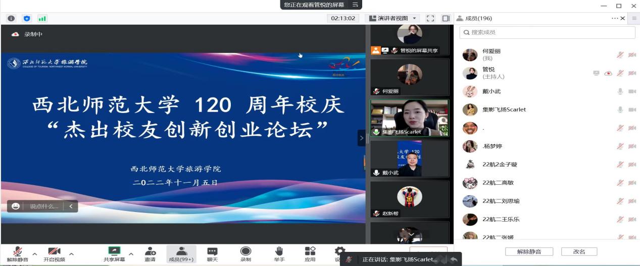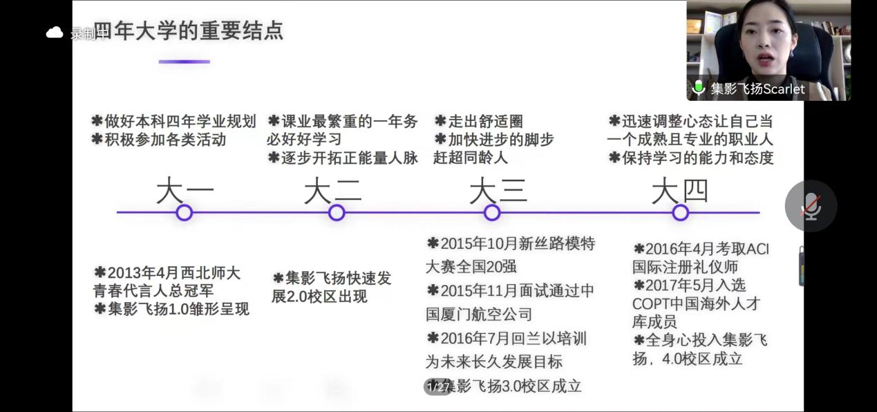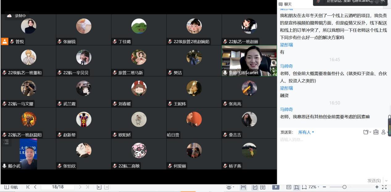2022年11月5日,304am永利集团官网线上开展百廿校庆“杰出校友创新创业论坛”报告会。2017届空中乘务专业校友、“集影飞扬”创始人任江应邀出席,并作题为“如何在本科阶段筹备创业,实现你的小目标”就业创业专题报告。学院副院长王力、党委副书记戴小武和专职辅导员线上参会,2022级全体新生、部分二、三年级本科生聆听报告并积极讨论交流。