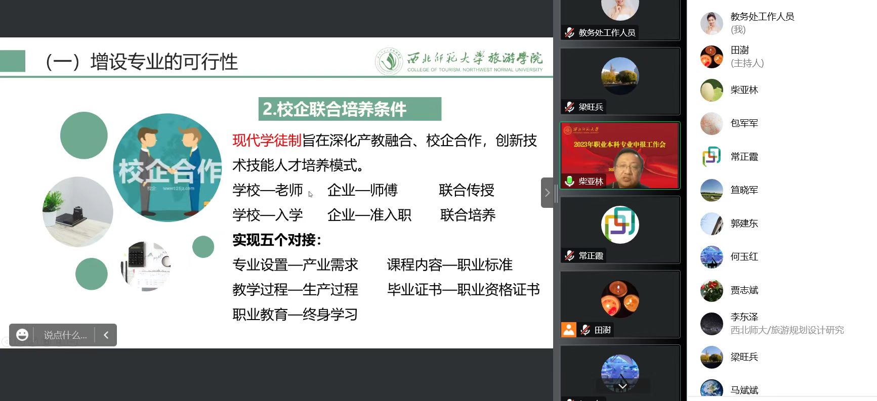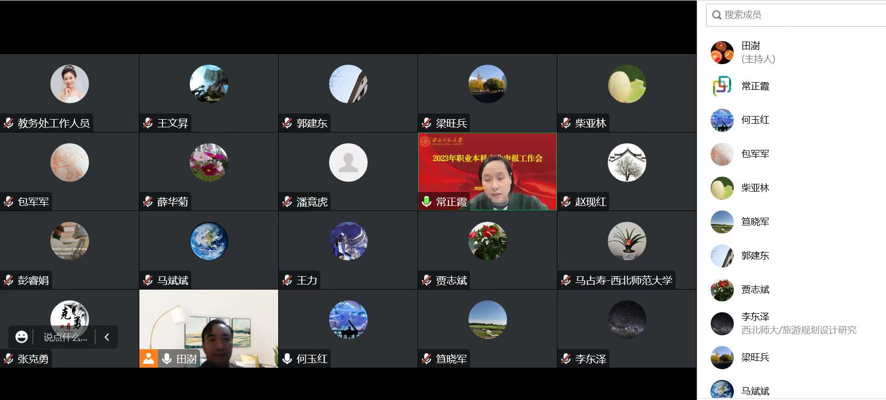2022年12月12日至13日,普通本科学校试办职业本科旅游规划与设计专业设置论证会在线上顺利召开。副校长田澍教授主持会议,校外评审专家河南财经政法大学旅游与会展学院院长赵现红教授、青海师范大学经济管理学院副院长薛华菊教授、中国城市发展研究院有限公司西北研究院院长笪晓军正高级经济师以及校内评审专家教务处处长何玉红教授、人事处王文昇处长、招生就业处郭建东处长、发展规划与学科建设处张克勇处长、国有资产管理处贾志斌处长、继续教育学院常正霞院长参加评审,教务处副处长潘竟虎教授、304am永利集团官网院长梁旺兵教授、继续教育学院马占寿副院长、财务处刘纪良科长与赵玲主任等列席会议,304am永利集团官网副院长柴亚林副教授汇报专业设置情况。