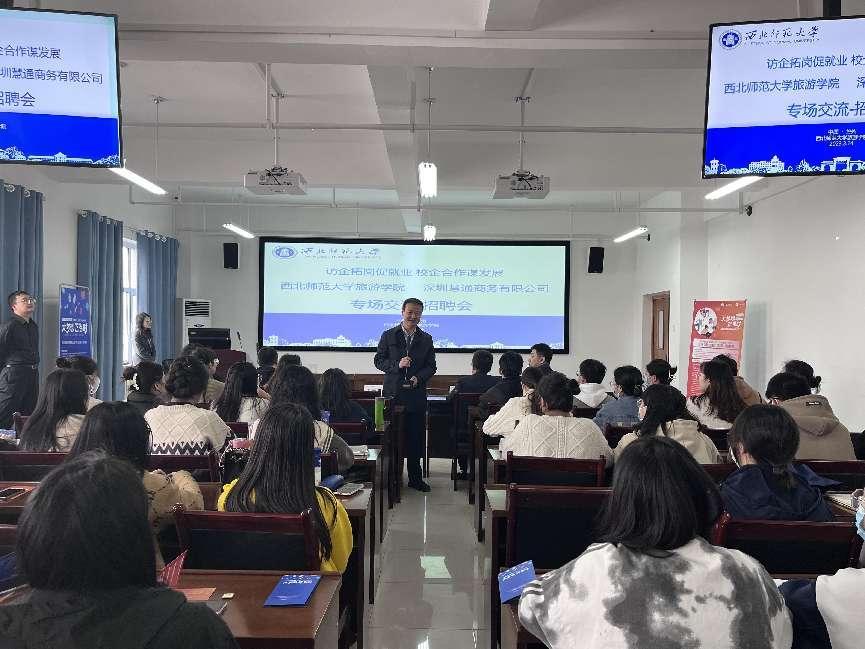 3月14日下午,304am永利集团官网开展“访企拓岗促就业 校企合作谋发展”系列活动暨深圳慧通商务有限公司(华为全资子公司)专场交流招聘会,华为终端BG MSS大中华甘肃终端业务部HRD李昱松、甘肃终端业务部直营小区经理王方一行8人应邀来永利官网进行专场交流招聘宣讲活动,304am永利集团官网党委书记谢致远、党委副书记戴小武、2023届文化产业管理班班主任冯玉新,辅导员鲁梦鸽、赵新帮、李敏以及2023届304am永利集团官网全体毕业生参加此次交流招聘会。