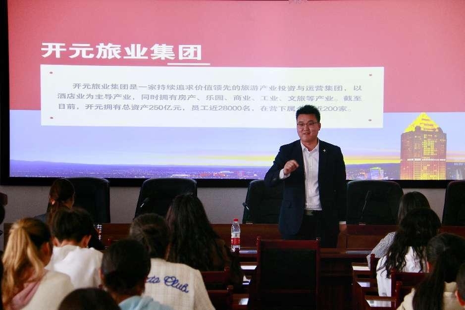 会上,单磊从企业概况、企业文化、职业发展方向、管培生晋升机制四个方面进行了详细讲解。通过分享2022届旅游管理专业毕业生司亚亚的切身经历和职业发展,让同学们对开元森泊有更加深入的认知和了解。他表示开元森泊急需大量专业管理型人员,希望通过合作培养旅游管理型人才,加强与学院的合作与交流。