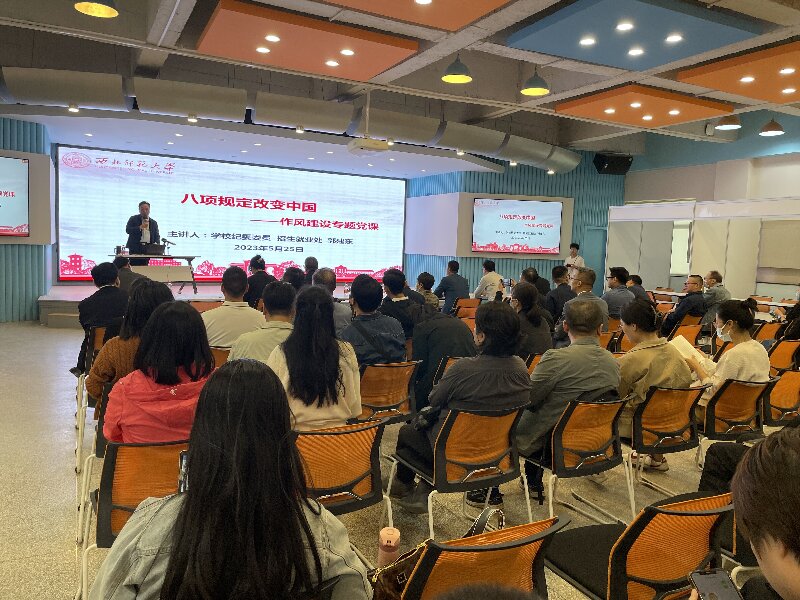 郭建东围绕“八项规定改变中国”这一主题,从中国共产党历来高度重视作风建设、八项规定如何改变中国、学校严格落实中央八项规定及其细则精神、作风建设永远在路上等四个方面进行了系统讲解,深刻阐述了党的十八大以来党中央出台中央八项规定的背景、意义,深入分析了十八大以来党的作风建设的新情况和一些新问题,并紧密结合学校实际提出注意通过教育警示党员教师守牢底线,抓好自身作风建设。