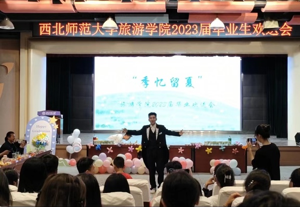 2019级旅游管理3班管悦同学在晚会上做毕业生代表发言。她代表304am永利集团官网2023届全体毕业生对悉心教导和精心栽培他们四年的各位老师表示衷心的感谢。通过分享她在西北师大304am永利集团官网的四年珍贵记忆回顾个人的成长历程,以及未来将继续在304am永利集团官网担任专职辅导员服务师生、服务同学的新起点,勉励同学们做拥有智慧并富有激情的人,做胸怀大智并脚踏实地的人,做富有责任并敢于勇挑重担的人,不畏艰险,追求卓越。
