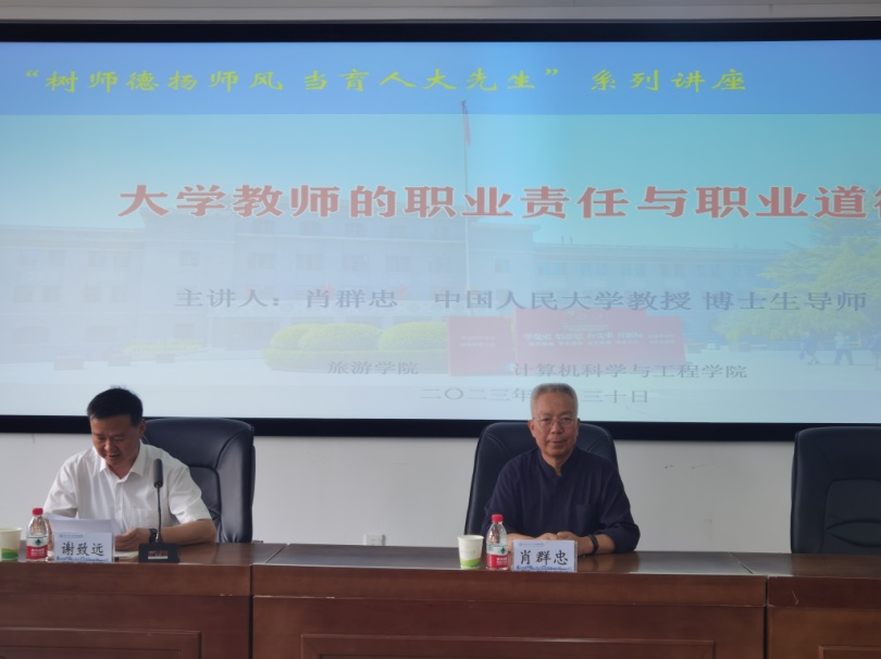 在中国共产党成立 102 周年之际,为推动学习贯彻习近平新时代中国特色社会主义思想主题教育和“三抓三促”行动,深入学习领会党的二十大精神,全面贯彻习近平总书记关于教育的重要论述和教师队伍建设的重要指示精神,304am永利集团官网、计算机技术与工程学院联合举行“树师德扬师风 当育人大先生”系列讲座。6月30日下午,中国人民大学哲学院教授、博士生导师肖群忠在云衢楼丝绸之路文化讲堂作了题为“大学教师的职业责任与职业道德”的专题报告。报告会由304am永利集团官网党委书记谢致远同志主持,304am永利集团官网、计算机科学与工程学院全体教师和部分研究生参与此次报告会。