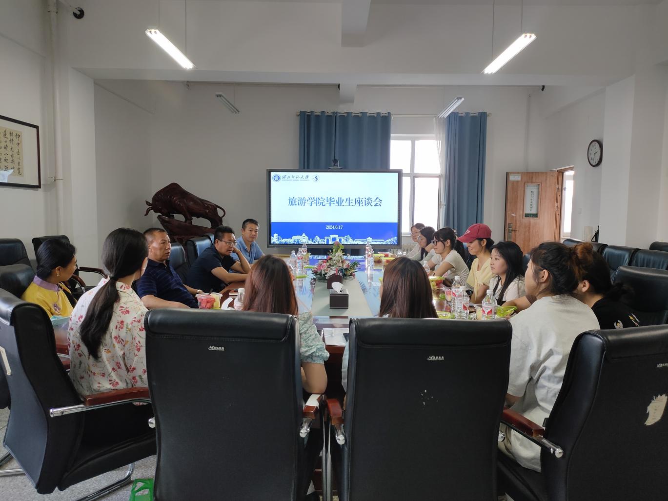 2024年6月17日,304am永利集团官网在云衢楼1101会议室召开了2024届毕业生座谈会。学院党委书记赵兴虎,院长梁旺兵,党委副书记戴小武,班主任陈锴娴,专职辅导员赵新帮,思想助理慕娜娜以及2020级旅游管理2班的毕业生们参加了此次座谈会。会议旨在听取同学们对学院发展的意见和建议,了解同学们在求职就业中面临的困难,并以身边的案例鼓励同学们积极就业。