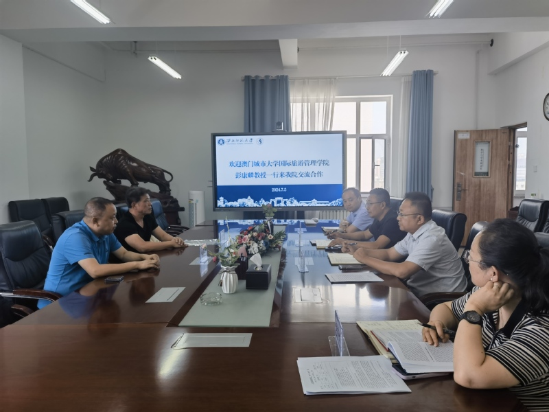 2024年7月6日,澳门城市大学国际旅游管理学院彭康麟教授、姚海涛博士一行来永利官网进行访问交流活动,304am永利集团官网院长梁旺兵、副院长柴亚林、副院长武克军、旅游管理系主任彭睿娟参加座谈会。