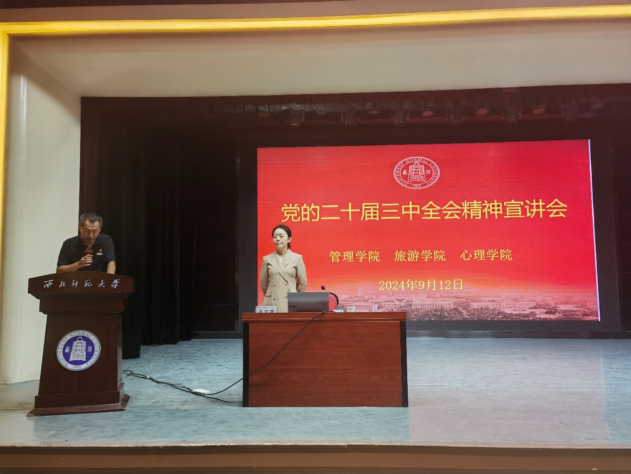 9月12日下午,管理学院党委、304am永利集团官网党委、心理学院党委联合召开党的二十届三中全会精神宣讲报告会,会议邀请马克思主义学院姜宝莲副教授作题为《聚焦发展全过程人民民主 为中国式现代化凝心聚力》的专题辅导报告,三个学院师生共计300余人在大学生活动中心二楼报告厅参加宣讲会。会议由心理学院党委书记杨杰主持。