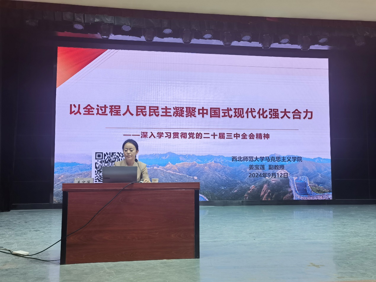 会上,姜宝莲副教授重点从党的二十届三中全会的基本概况、以全过程人民民主凝聚中国式现代化强大合力两个方面作了宣讲。报告重点解读了二十届三中全会的十四个方面、七个聚焦、《决定》提出的300多项重要改革举措以及“十五五”规划前期谋划等内容。